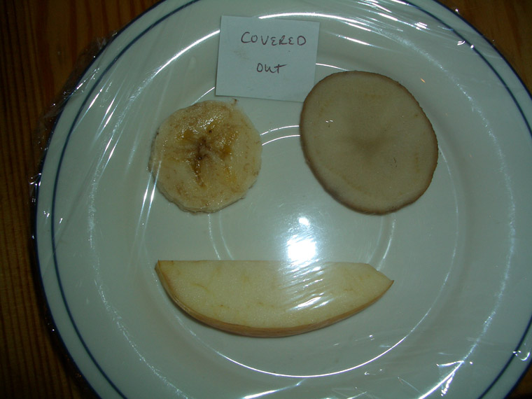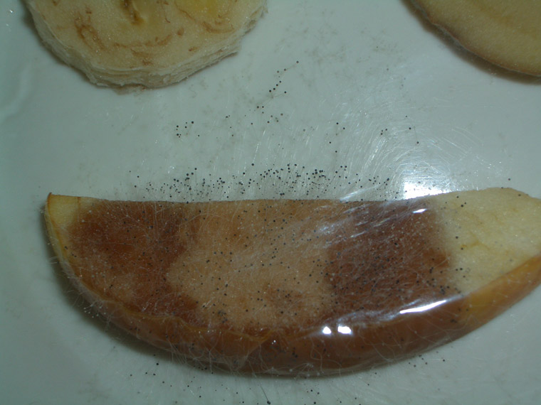 We observed that the mold had covered the paper so much we could barely read it, and the banana and apple were really gross.