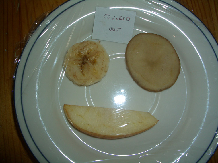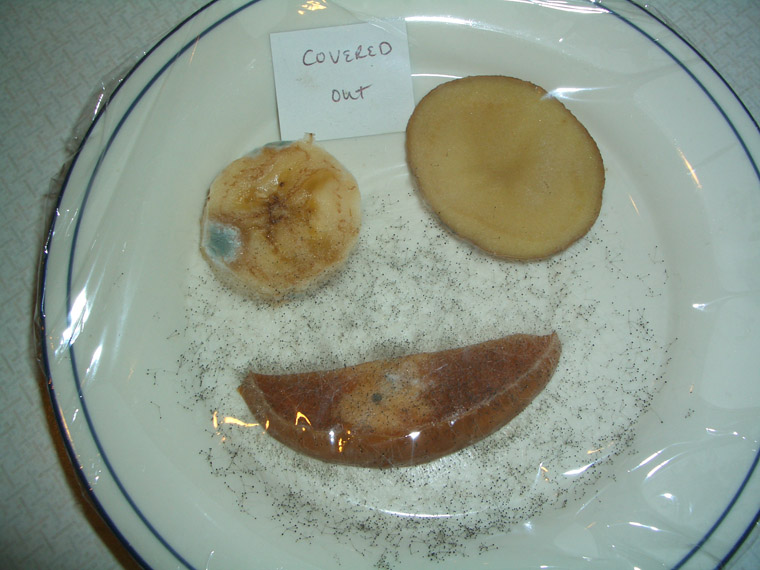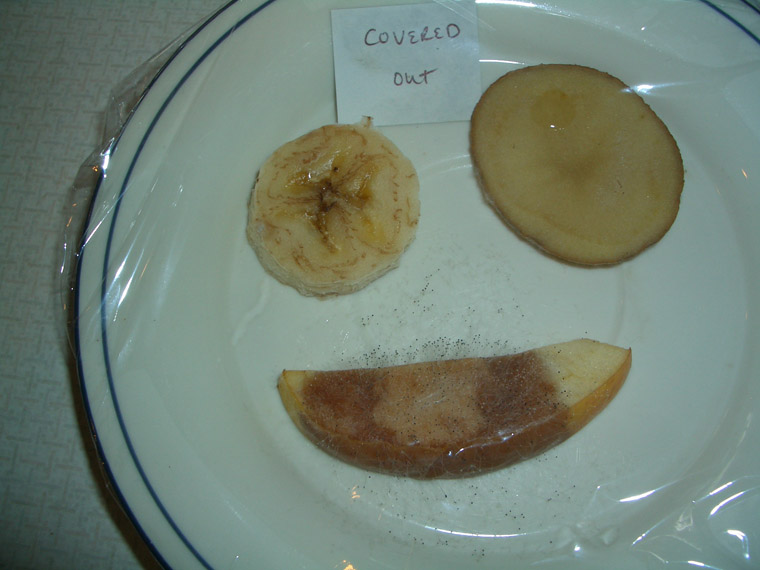 We observed more mold growth on the plate and the banana's gray patch had gotten bigger while another gray patch was growing. (Note: Evan patted the top of the plastic wrap down onto the food just prior to the photo...I attempted to lift the plastic off the food without opening the seal, but the apple and banana did get very slightly squished and the plastic clung to the banana.)