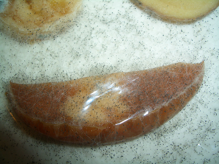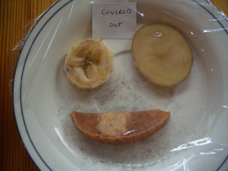 We observed that the mold was on the potato now and also on my paper label, and the banana's gray patches were larger.